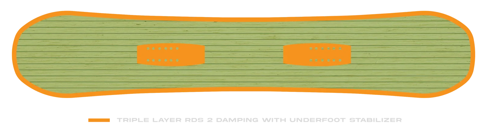 Легкая система демпфирования. Три более узких демпфирующих слоя, которые обеспечивают идеальное сочетание поглощения вибрации, и стабилизируют нос и хвост сноуборда. RDS 2 — это идеальный баланс стабильности для фрирайда и живости для фристайла.