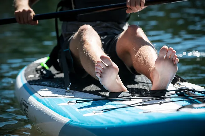 Устали стоять? Гребете при сильном ветре? Нет проблем, просто сядьте в прикрепляемое сиденье из пены EVA, которое соединяется специальными ремнями со встроенными D-образными кольцами. Разберите ручку весла, чтобы снять одну секцию и сделать весло с двумя секциями. Теперь у вас получился каяк!