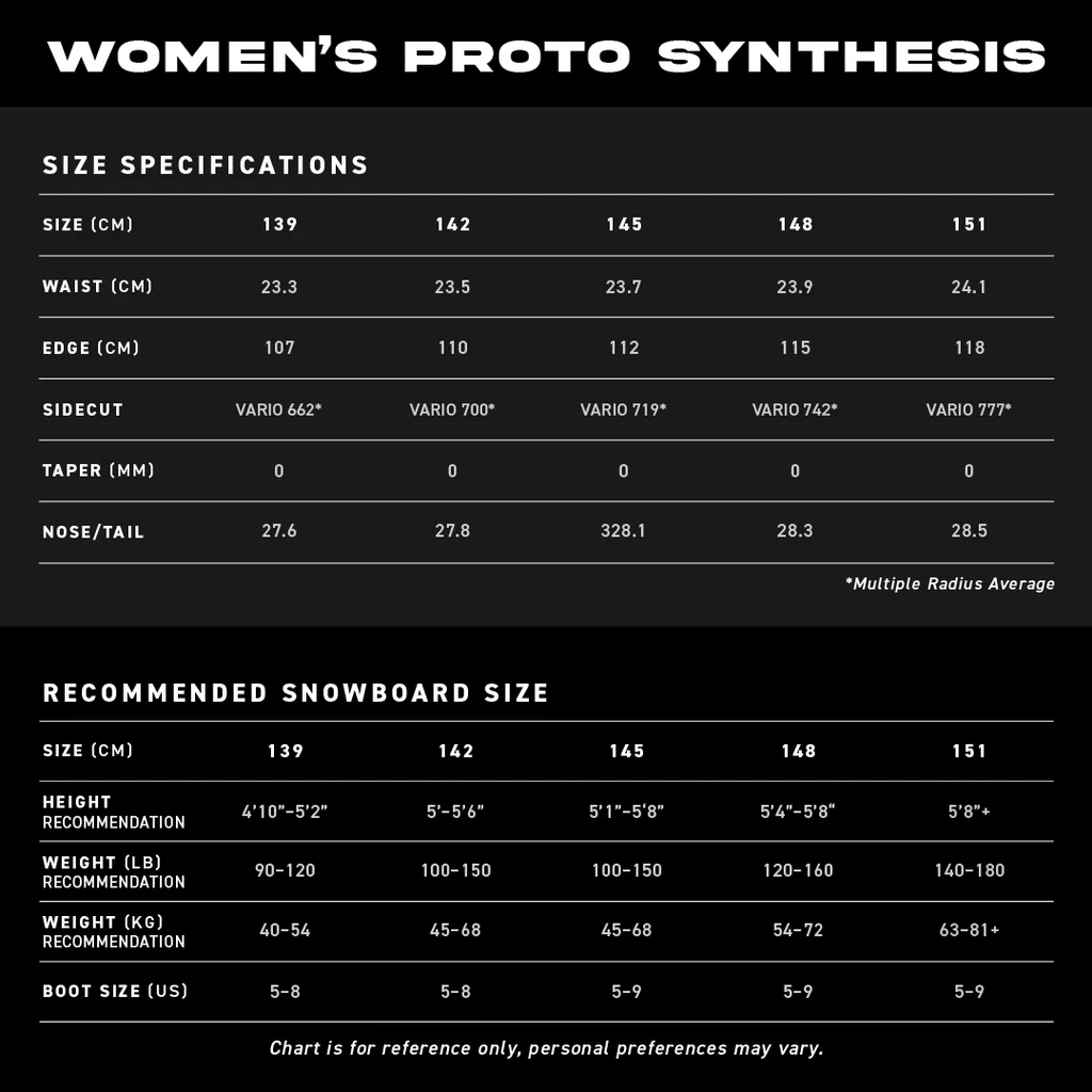 Женский сноуборд Never Summer Proto Synthesis — идеальная all mountain доска, которая подойдет для любых условий. Едет быстро, делает резкие повороты и позволит вам кататься в свиче. Прогиб Rocker Camber и Recluse Max Carbon обеспечивают взрывной запас энергии, производительности и мощности, сохраняя при этом то серфовое, плавучее, прощающее чувство, которым славится прогиб Rocker Camber.