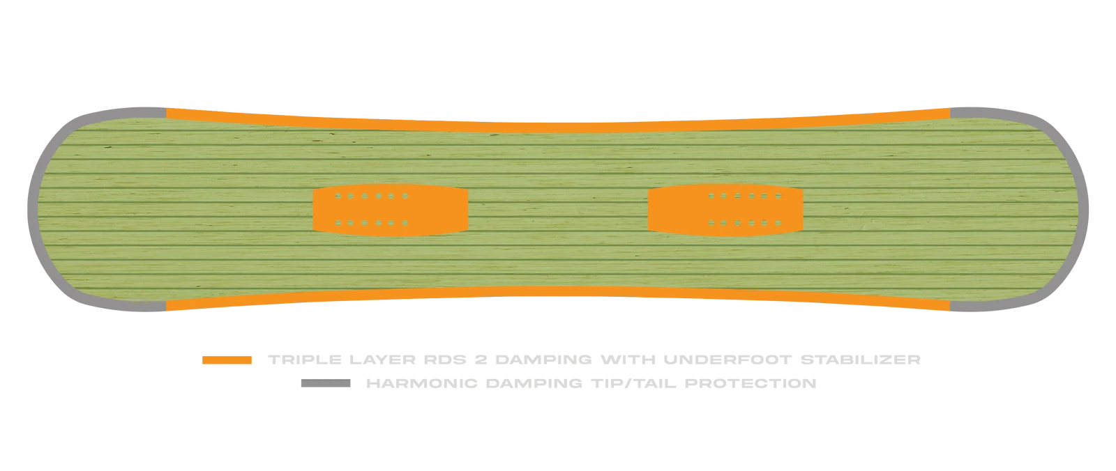 RDS 2 или Rubber Damping System 2 — это несколько слоев специальных демпфирующих вставок, которые обеспечивают идеальный баланс стабильности во фрирайде и живости для фристайла. Демпфирующие вставки обеспечивают идеальное сочетание поглощения вибрации и ощущения энергии, а также стабилизируют нос и хвост сноуборда.