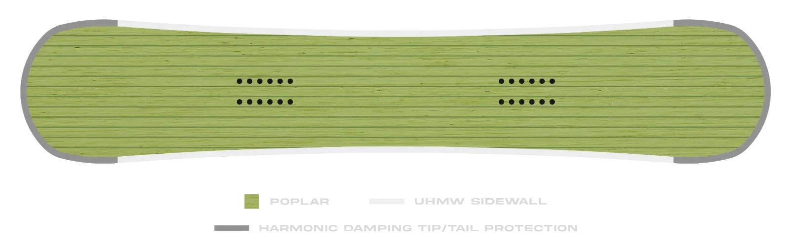 Деревянный сердечник ALLPOP WOOD CORE состоит из чрезвычайно легких стрингеров из тополя по всей длине деревянного сердечника. Эта прочная древесина обладает высокой ударопрочностью и очень энергична, обеспечивая последовательный и стабильный рисунок гибкости. Древесина тополя также обладает естественными характеристиками амортизации, что обеспечивает сноуборду очень плавный ход.
