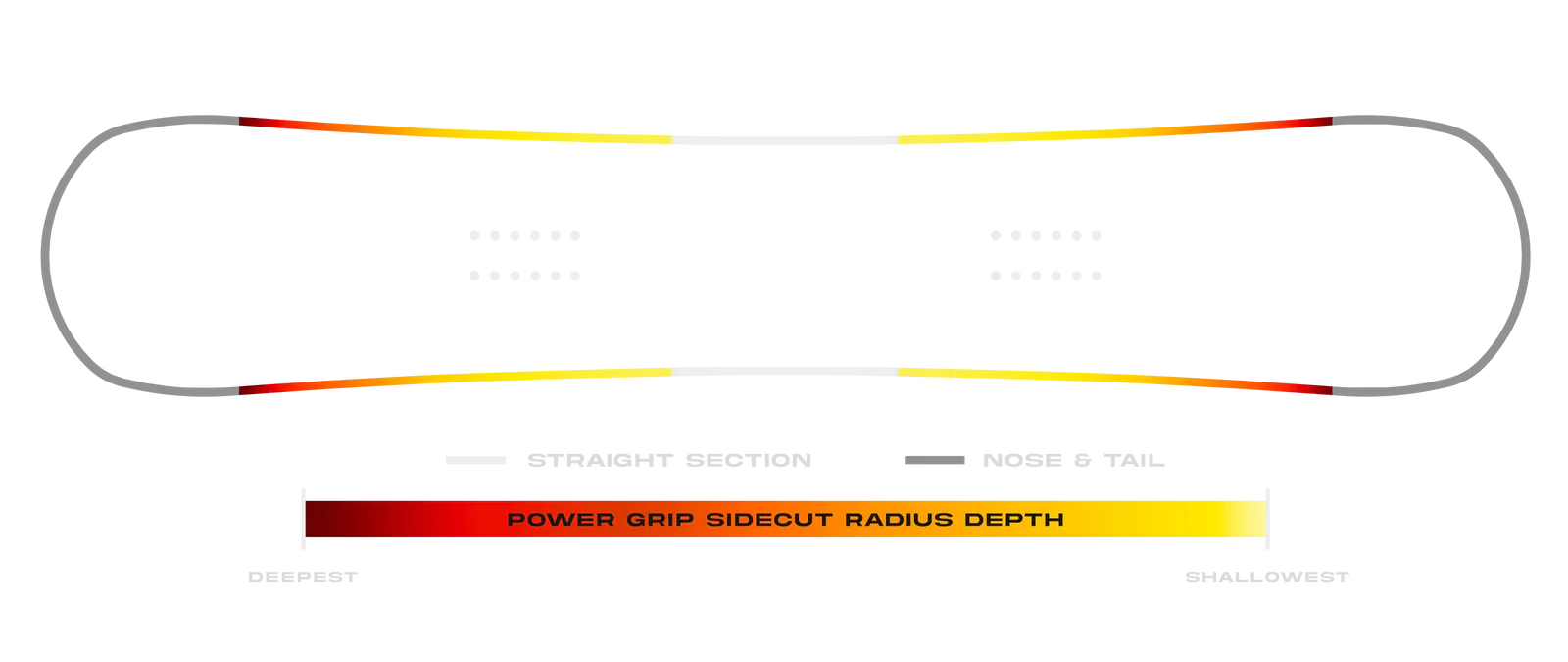 Использование нескольких боковых радиусов создает дополнительные контактные точки для лучшего удержания доски на трассе. Плоская секция в зоне рокера увеличивает площадь контакта и обеспечивает еще лучшую устойчивость доски.